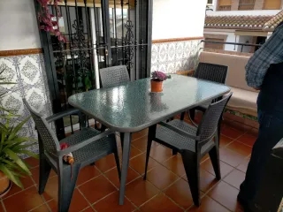 Mesa de terraza cristal y metal con cuatro sillas