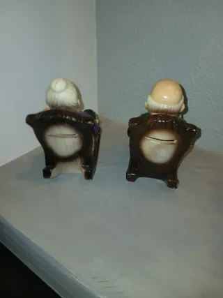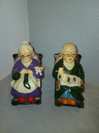Conjunto de figuras huchas con diseño de abuelos sentados en sus sillas. - Hechas de cerámica. - Detalles en plástico.