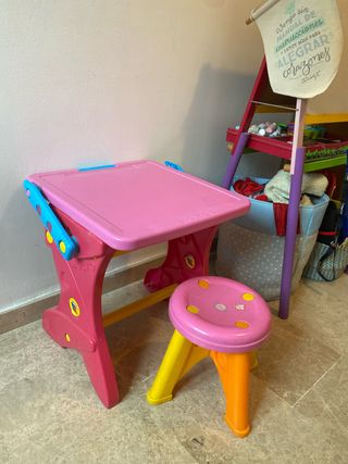 Conjunto de escritorio y silla infantil Molto, convertible en pizarra. - Superficie de escritura rosa. - Silla con asiento rosa y patas de colores. - Estructura de plástico resistente. Espacio para tizas y estuche segun se use de escritorio o de pizarra. Muy muy funcional. Mi hijo lo ha estado usando hasta los 6 años casi todos los dias para deberes, pintar, leer, acuarelas.... Se regala con tizas de colores.