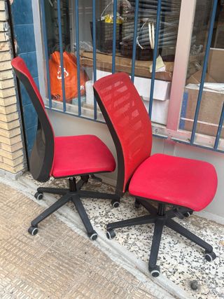 Conjunto de dos sillas de oficina con un diseño moderno y ergonómico. - Asiento y respaldo en tela roja. - Base y estructura en plástico negro. - Ruedas para fácil movilidad. Las dos a 30€ una unidad a 20€