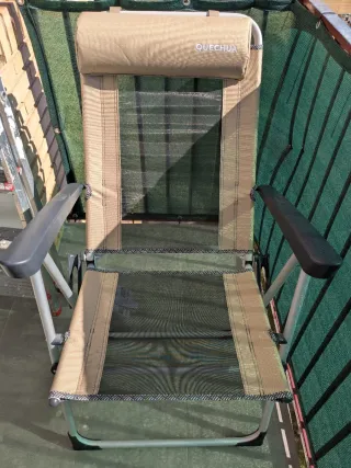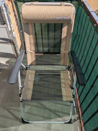 Silla de camping Quechua, cómoda y práctica para exteriores. Casi nueva ya que apenas tiene uso. - Estructura de metal y plástico. - Asiento y respaldo de tela. - Color beige y gris.