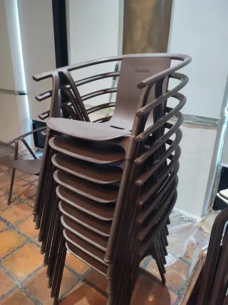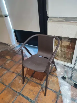 Conjunto de sillas de plástico marrones. - Diseño moderno y apilable. - Patas resistentes para mayor estabilidad. 4€ cada silla
