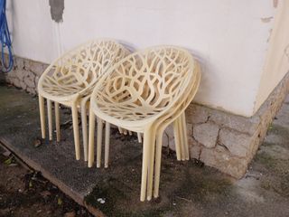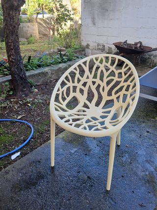 Lote de 6 sillas de jardín modernas estilo Ghost (beige claro), perfectas para terraza o patio exterior. Diseño transpirable y ligero con estructura de resina/rattan sintético en forma de ramas entrelazadas, muy resistentes a la intemperie, sol y humedad. Apilables para fácil almacenamiento. Estado: Buenas condiciones generales, sin roturas graves; leves marcas de uso normales por exterior Precio: 50 € el lote completo.