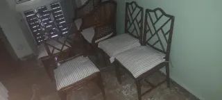 Se vende conjunto de seis sillas de comedor con un diseño clásico y elegante. - Estructura de madera maciza. - Asientos tapizados y respaldos de ratán. - Tonos naturales que combinan fácilmente. Están en buen estado aunque varias necesitan reparación por cimbreo.