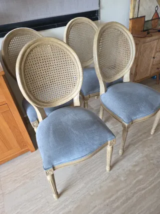 Conjunto de seis sillas de estilo francés, perfectas para añadir un toque elegante a tu hogar. - Diseño clásico con respaldo y asiento de rejilla. - Patas curvas y detalles ornamentales en la madera. 50€/silla