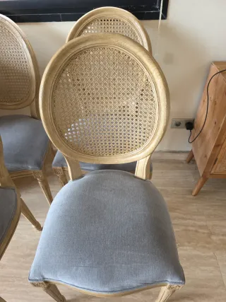 Conjunto de seis sillas de comedor con un diseño elegante y clásico. - Estructura de madera con detalles tallados. - Asientos tapizados en tela gris. - Respaldo con tejido de ratán. - Patas de madera con acabado natural. 2 de ellas requiren encolado al estar algo sueltas, nada que no se pueda arreglar fácil - Su precio de compra nuevas fué de 130€ cada una.