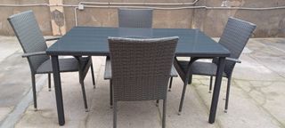 Conjunto de mesa y cuatro sillas de exterior. Mesa 150 x 90 . - Mesa con sobre de cristal. - Sillas de mimbre con estructura resistente. - Diseño moderno y elegante. Rattan sintético en tonos grises. Posibilidad de transporte.