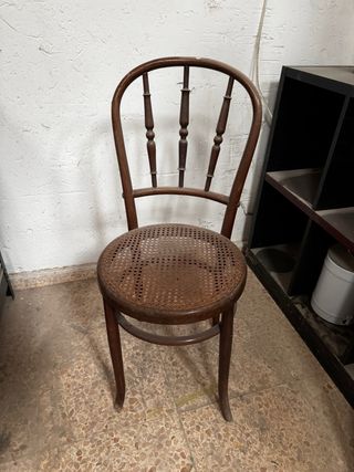 Silla de estilo modernista con un diseño clásico y elegante. - Estructura de madera curvada. - Asiento de rejilla de rattan. - Respaldo con varillas torneadas.