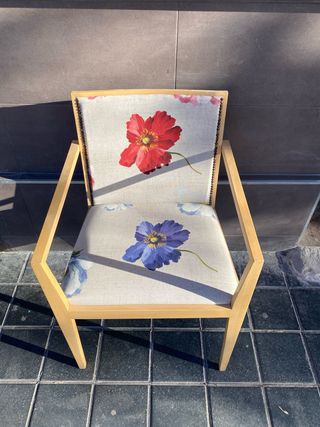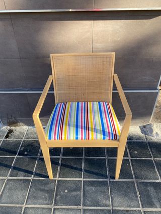 Elegante silla con un diseño moderno y un asiento vibrante. - Algún respaldo tejido en rattan. - Patas y estructura de madera. - Recientemente tapizado. - Cada una es diferente.