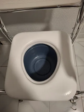 Silla de baño con inodoro con ruedas, en muy buen estado y poco uso. Ideal para personas con movilidad reducida, personas mayores o en procesos de recuperación. Dispone de: • Asiento con orificio y cubeta extraíble, fácil de limpiar • Respaldo ergonómico y cómodo • Reposabrazos abatibles para facilitar transferencias • Ruedas con freno, segura y estable • Estructura resistente y fácil de manejar Perfecta para uso doméstico, hospitales o residencias. Lista para usar.