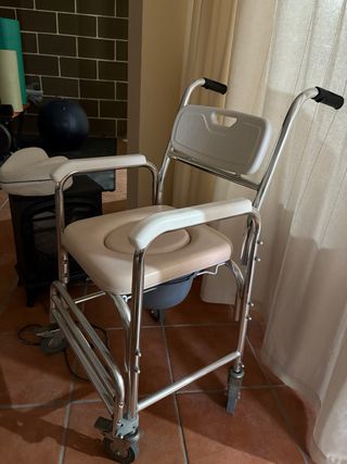 Silla de ducha y WC con estructura metálica y asiento de plástico. Los pies son abatibles para mayor comodidad. - Asiento y respaldo acolchados. - Reposabrazos. - Ruedas para facilitar el desplazamiento. La compré en diciembre pir un accidente que tuve. Está como nueva. Se entrega limpia y desinfectado. Silla de Ruedas ideal para uso en hospitales, centros de salud, geriátricos, hogares ya que es un producto indicado para personas ancianas, con incontinencia o movilidad reducida dado que facilita el aseo y la higiene diaria.