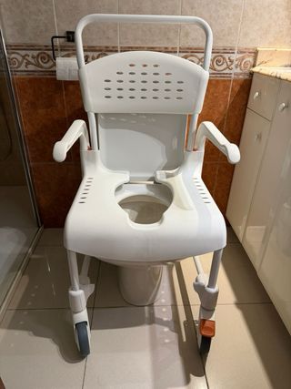 Vendo silla de ducha, considerada la mejor del mercado por su diseño, resistencia y maniobrabilidad. Es el modelo de 55 cm de altura (el más alto), ideal para colocar directamente sobre cualquier inodoro, incluso los más modernos o con elevador. - Características principales: - Asiento y respaldo blando - Usada solo una vez - Higiene total: El asiento está abierto por la parte trasera y tiene una escotadura delantera - Reposapiés inteligente: Se desliza debajo del asiento. No se pierde y no estorba al sentarse o levantarse. - Maniobrabilidad: Se mueve con un dedo - Seguridad: Ruedas con frenos - Se entrega totalmente desinfectada