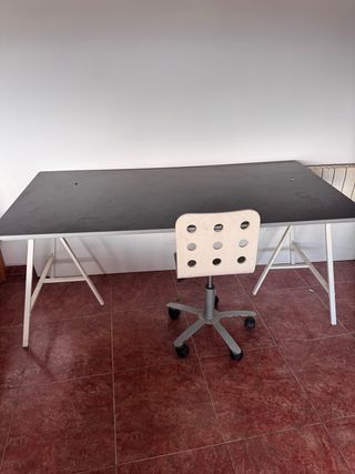Conjunto de escritorio plegable y silla de oficina. - Estructura del escritorio en metal. - Silla con base de plástico y ruedas.