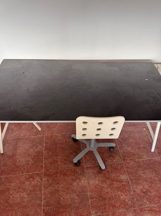 Conjunto de escritorio con superficie oscura y silla infantil con ruedas. - Escritorio con patas metálicas plegables. - Silla con asiento y respaldo perforados.