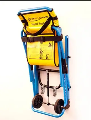 Silla de evacuación Evac Chair, diseñada para facilitar el desplazamiento de personas. - Estructura de metal resistente. - Asiento y respaldo de tela. - Ruedas para facilitar el movimiento.
