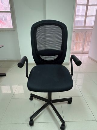 Silla de oficina Ikea en color negro, ideal para tu espacio de trabajo. - Respaldo de malla transpirable. - Asiento acolchado para mayor comodidad. - Base con ruedas para fácil movilidad.
