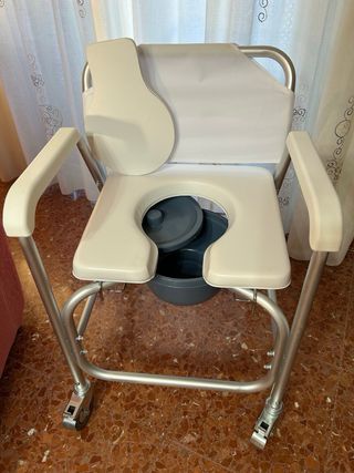 Se vende silla de baño con ruedas, ideal para personas con movilidad reducida. Está en muy buen estado y es fácil de usar. - Estructura de aluminio resistente. - Asiento cómodo y acolchado. - Ruedas para facilitar el desplazamiento. - Reposabrazos para mayor seguridad.