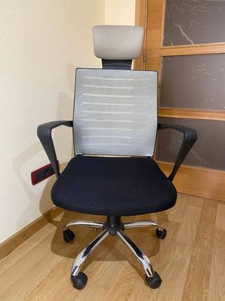 Silla de oficina con diseño ergonómico y reposacabezas. - Respaldo de malla transpirable. - Asiento acolchado. - Base metálica con ruedas. - Altura regulable - Con reposacabezas - En buen estado Esta silla ya ha sobrevivido a un gato y sigue perfecta. Si tienes gato en casa, esta silla ya está entrenada 😄