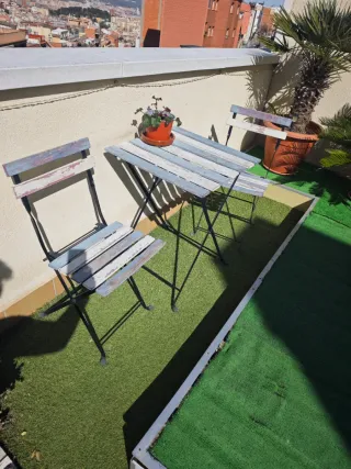 Conjunto de mesa y dos sillas, ideal para espacios pequeños o como mesa auxiliar. Impecable. Tamaño mesa cerrada: 80x75x80 Abierta: 120x75x80 - Mesa con superficie de madera. - Sillas con estructura de plástico.