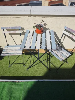 Conjunto de dos sillas plegables de Ikea. Su diseño las hace prácticas y fáciles de guardar. Buen estado, la pintura es descolorida del sol. Precio original 40eur por las dos sin cojines. - cojines incluidos si los quiera Tengo tambien mesa y 2 sillas nuevas, el set viene con descuento.