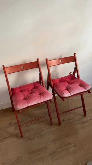 Conjunto de dos sillas plegables de Ikea. Su diseño las hace prácticas y fáciles de guardar. Como nuevas, embalajados. Precio original 52 eur por las dos con cojines. - cojines nuevos incluidos si los quiera Tengo tambien mesa y 2 sillas usadas, el set viene con descuento.