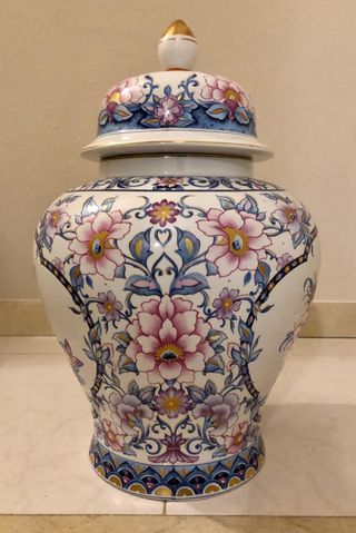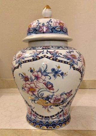 Tibor vintage de porcelana pintado al fuego y con detalles en pan de oro. Altura 45 cm. Diámetro 28 cm. Recogida en Sant Andreu de Llavaneres Butaca, sofá, sillón, butacón, lámpara, alfombra, espejo, mesa, sillas, librería, boureau, escritorio, bufet, mueble, vitrina, decoración, vajilla, cristalería, cubertería, modernista, anticuario, retro, vintage, isabelino, art-déco.