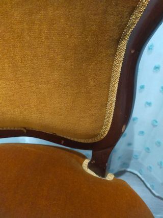 Precioso juego de seis sillas de estilo isabelino. Son sillas antiguas, con una estética clásica y elegante. - Patas de madera torneadas. - Tapicería de terciopelo en color mostaza. se requiere una pequeña restauracion por eso el precio 100€ las 6 sillas