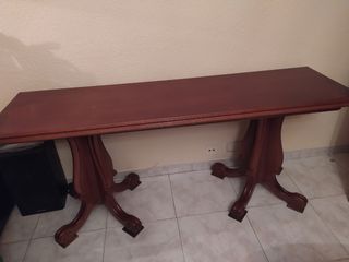 Mesa aparador de madera maciza. Alargada. Se abre y se duplica el ancho. Tiene una marca según aparece en la foto. Va con tres sillas a juego. Recogida en Santa Eugenia (28031)