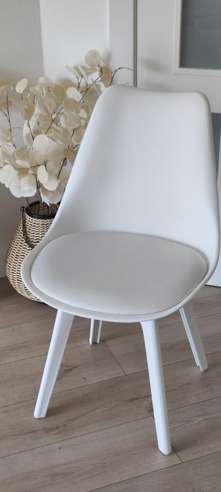 Preciosa silla de salón o escritorio, de color blanco y fabricada en resina. Es elegante y ligera. - Diseño moderno y minimalista. - Asiento cómodo y acolchado. - Ideal para cualquier espacio.