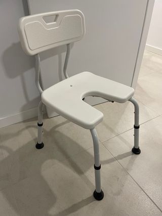 Silla de ducha para baño, muy estable y segura. Incluye respaldo, patas regulables en altura y asiento en forma de U que facilita la higiene. Estructura de aluminio resistente y asiento de plástico antideslizante. • Altura regulable • Patas con conteras antideslizantes • Respaldo ergonómico • Muy ligera y fácil de mover • Ideal para personas mayores o con movilidad reducida 📍 Recogida en Santa Coloma de Gramenet 🚚 Sin opción de envío