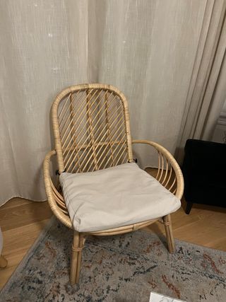 Silla de ratán con cojín en color beige. Por 30€ si se recoge en persona. - Diseño moderno y ligero. - Estructura de ratán natural. - Cojín de tela suave.