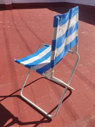 Silla pequeña plegable con un diseño de rayas azules y blancas. Es ligera y fácil de guardar. - Estructura de metal. - Asiento y respaldo de polietileno.