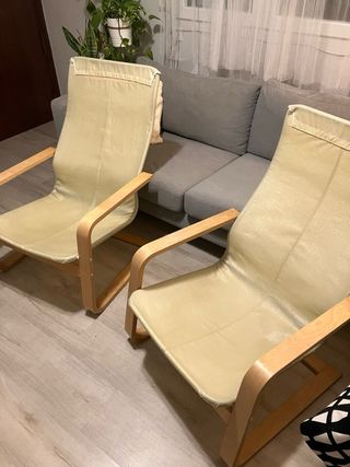 Se venden dos estructuras de silla Poäng de Ikea, están en buen estado, han estado en exterior, también regalo funda y cojines beige con bastante uso si te vienen bien. - Estructura de madera curvada. - Diseño ligero y moderno.