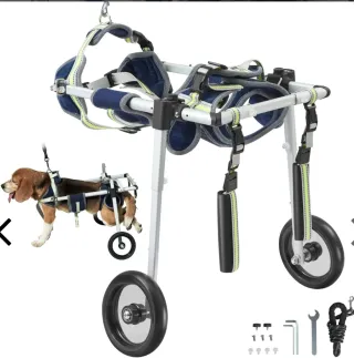 Silla de ruedas para perros con estructura de aluminio y arnés acolchado. - Arnés ajustable para mayor comodidad. - Ruedas resistentes para facilitar el movimiento. - Diseño ligero y duradero.