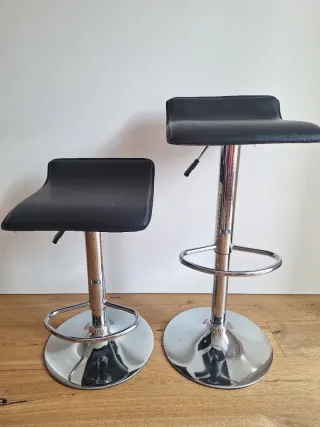 Pack de 2 taburetes modernos de cocina. Precio nuevo: 62€ cada uno. Color: negro Asiento acolchado, fácil de limpiar (tipo polipiel) Altura regulable con pistón Giro 360º Reposapiés cromado Base amplia y estable Estilo moderno, ideales para barra de cocina o isla Se aprecian ligeras marcas normales de uso.