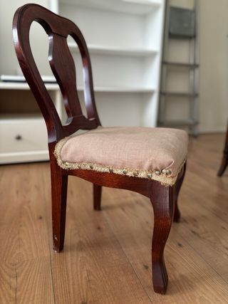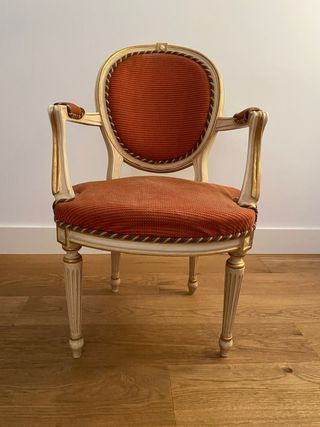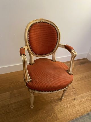 Dos sillas estilo Luis XVI de madera con respaldo de ratán y asiento y reposabrazos tapizados. Tienen una estructura preciosa y muchísimo potencial. Están muy usadas, quería restaurarlas pero no sé hacerlo y contratarlo es caro. Me da mucha pena venderlas pero no tiene sentido quedármelas, ojalá alguien sepa darles una segunda vida. La pata delantera de una de ellas se ha metido hacia dentro, es lo más crítico, está en la última foto. (Precio por las dos sillas, una por 20€)