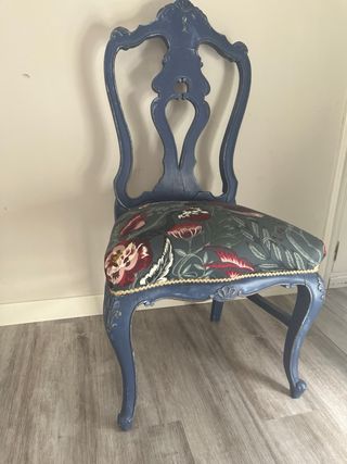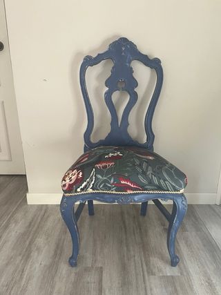 Espectacular y exclusiva silla/descalzadora isabelina de estilo luis XVI. Los detalles de madera labrados a mano la hacen única, exclusiva e irrepetible. El tapizado de terciopelo azul se conserva original. Por su impacto decorativo no pasará desapercibida allá donde se ponga. Todos los materiales son respetuosos con el medio ambiente.