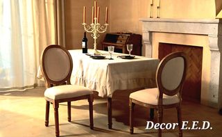 Elegantes sillas estilo Luis XVI con un diseño clásico y lujoso. - Tapicería de tela y terciopelo. - Estructura de madera. - Detalles ornamentales dorados.