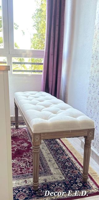GRAN BANCO DE SEIS PATAS TAPIZADO ACOLCHADO EN ALGODÓN COLOR BEIGE, DISEÑO VINTAGE, ESTILO LUIS XVI. MADERA DE ABEDUL CON ACABADO DECAPADO. MEDIDAS: 1,22 cm (Largo) x 42,5 cm (Fondo) x 48 cm (Alto). PERFECTO ESTADO. SIN ESTRENAR.