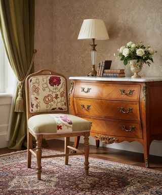 Elegante silla de comedor con un diseño clásico. - Patas de madera tallada. - Asiento tapizado con estampado floral. - Respaldo curvo con detalles ornamentales.