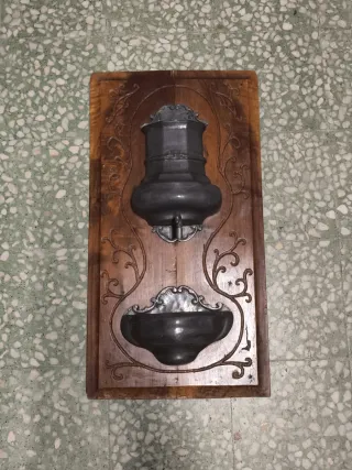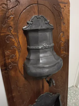 Antigua fuente de agua, aguamanil o lavamanos decorativo. Realizado en peltre, está montado sobre placa de madera para colgarlo a la pared Mide 86*46cm VDV3193 antiguo antigüedad vintage retro rústico barroco isabelino victoriano Luis XV XVI plata alpaca espejo veneciano óleo cuadro lienzo virgen capipota capilla zara kave home aplique becara Borgia Conti hanbel valenti midcentury lavabo don Pedro Manises bambú provenzal cómoda butaca silla jofaina cartuja bronce pan de oro dorado tibor lebrillo jarrón figura escultura neogótico lámpara alfombra grifo candelabro hachero Triana Talavera cerámica porcelana Limoges Sévres Meissen sol