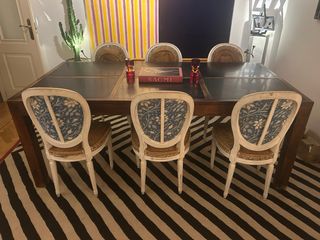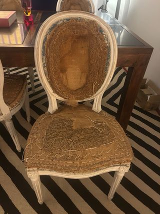 Conjunto de seis sillas estilo Luis XVI, adquiridas en la tienda La Europea en Madrid. Perfectas para dar un toque vintage a tu comedor o salón. - Estructura de madera. - Asiento y respaldo de yute. * Mesa también en venta (opcional) por 450 €