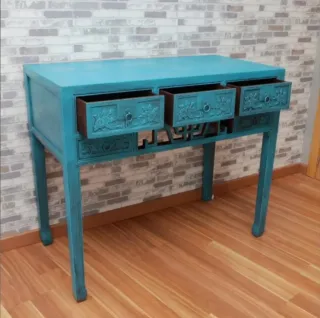 Aparador Oriental Madera maciza tallada color Azúl turquesa efecto decapé Con 5 cajones alargados hasta el final del mueble. Medidas : 100cm largo x 50cm fondo x 85cm alto. palabras clave: recibidor consola entrada entradita cómoda coqueta mesitas sillas sillones mesillas aparador despacho butaca sillón taquillón luis xv luis xvi isabelino antigüedad antiguo vintage retro clásico imperio napoleón anticuario provenzal antique estilo decoración Mariano Garcia viejoybonito Zara home Maison du monde Becara oriental chino asiático