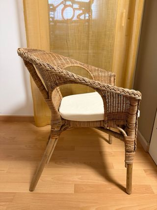 Silla de mimbre Agen de Ikea con cojín. Se ha usado como silla de adorno nada más. Tiene alguna marca en las patas, tal y como se ve en las fotos. Precio original: 79€