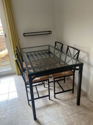 Conjunto de comedor con mesa de cristal y cuatro sillas, además de una estantería. - Mesa con sobre de cristal y estructura metálica. - Sillas con asientos de mimbre y estructura metálica. Usado por mi una mujer de edad y mi hijo, bien tratrada.