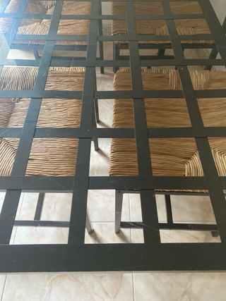Conjunto de mesa fija de forja en color negro con sobre de cristal, con 6 sillas de forja y asientos de mimbre de IKEA. Conjunto de segunda mano en perfectas condiciones, muy cuidado y listo para usar. Ideal para comedor, terraza cubierta o jardín de invierno, aportando un estilo elegante y atemporal. La estructura de forja es resistente y estable, mientras que el cristal facilita la limpieza y el mantenimiento. Las sillas son cómodas y firmes, con mimbre en excelente estado. Perfecto para reuniones familiares o comidas con invitados. Medidas: centrimetros Mesa: alt. 76, larg. 146 y anch. 78 Sillas: alt. 46 /85, anch. 43 y fond. 42.