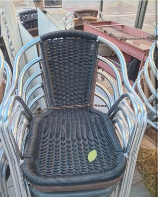 Conjunto de sillas de exterior, perfectas para tu terraza o negocio. 25 unidades - Estructura de metal plateado. - Asiento y respaldo de mimbre negro.