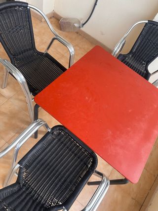 Conjunto de mesa redonda y cuatro sillas de exterior, ideal para tu terraza o jardín. El diseño combina materiales para un acabado moderno y resistente. - Mesa con superficie de madera. 60€ - Sillas con estructura de metal y asiento de mimbre. - Diseño de 5 sillas. 25 u. - Hay que limpiarlas y darles barniz