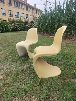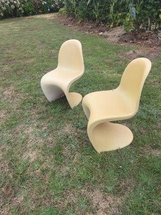 Juego de 2 sillas Panton color mandarina. Compradas en Vitra Color: Mandarina Precio en tienda 345 EUR / unidad Respaldo, asiento y base: polipropileno teñido, 100 % reciclable. Acabado mate. Apta para su uso en exteriores de forma temporal o estacional. Precio por las 2 sillas 400€ no se venden por separado,se venden juntas.