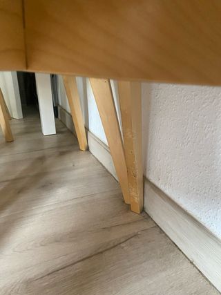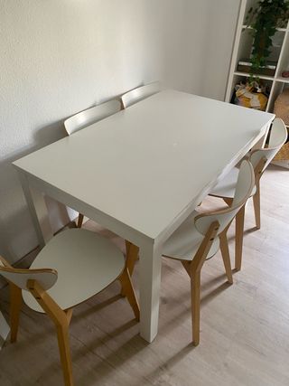 Conjunto de mesa de comedor con seis sillas. - se vende por cambio del mismo - Mesa blanca. - Sillas con asiento blanco y patas de madera. - algunas patas están arañadas y un poco mordidas por un bebé perro que tenemos, si se lija queda perfecta